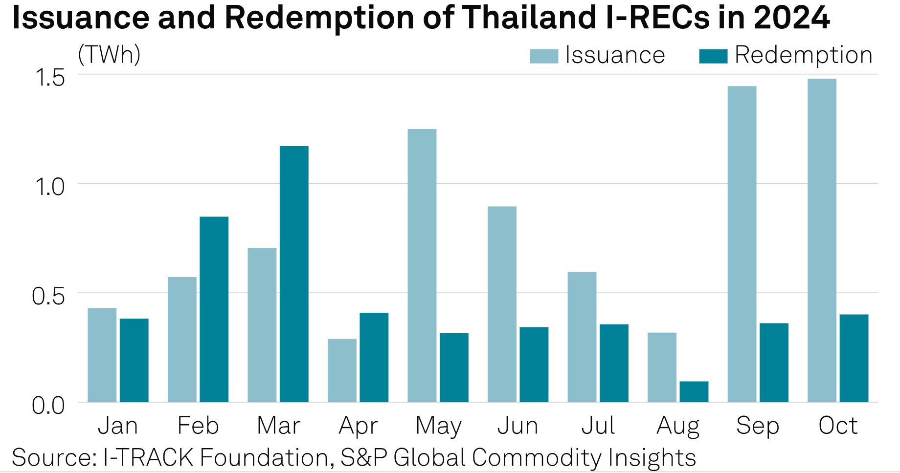 The Thailand International Renewable Energy Certificate (I-REC) market continues to grapple with significant oversupply, despite recording its highest issuance figure in October 2024. The market saw an issuance of 1.48 TWh from January to October 2024, marking a 2.3% increase from the previous month. However, redemption rates remained low, reaching only 0.4 TWh, a modest 9.99% increase from the prior month.