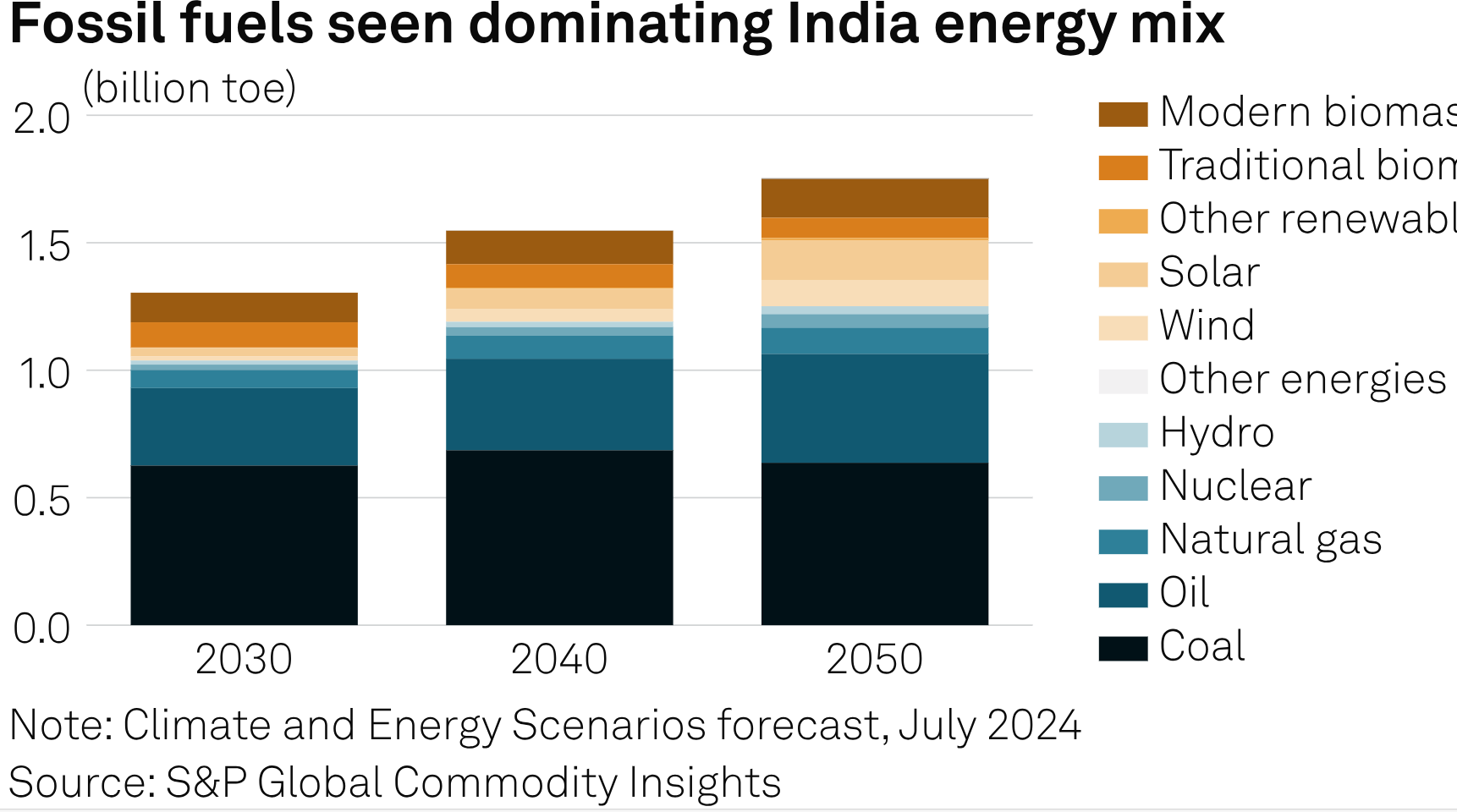 Despite these efforts, India's reliance on fossil fuels will remain substantial until the 2040s due to rising energy demand, with renewable sources like wind, solar, hydro, and biomass seen making up about 24% of the energy mix, according to data from S&P Global Energy.