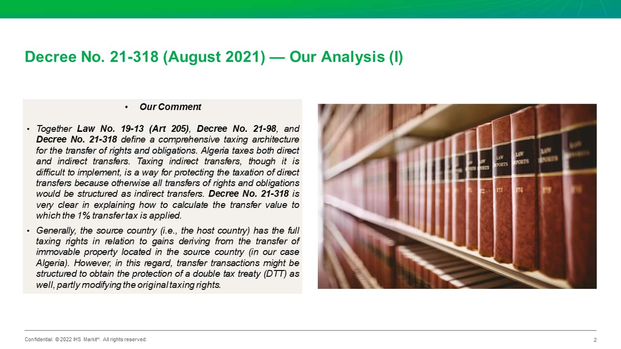 Law No. 19-13 and its implementing decrees have modified, one more time, Algeria's legal/fiscal framework for the hydrocarbons sector. The goal of this reform was to spur foreign direct investment (FDI) in the hydrocarbons sector. Until now, the results have been mixed, with increased interest in Algeria's hydrocarbons sector over the first six months of 2022 probably due more to the current Russia-Ukraine conflict than to the reform of the legal/fiscal framework for the hydrocarbons sector. The resulting system is not simple, as the country, for contracts involving contractors other than Sonatrach, is now going to manage three different types of hydrocarbon contracts, which is not an easy task. Moreover, while the enacted decrees have provided some clarification on some points that were not defined in Law No. 19-13, the decrees are many in number, and some fiscal calculations are quite complex.