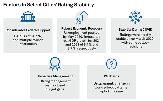 Although COVID-19 had a significant effect on major U.S. cities, strong management conditions and considerable federal support prevented credit deterioration. The sudden stop recession was shorter, and the economic rebound stronger, than anticipated, leading to more robust revenue for local governments than originally expected. Unprecedented federal relief was a lifeline and abated liquidity pressure. Current challenges for big cities include the delta variant, changing work/school patterns, and an uptick in violent crime.