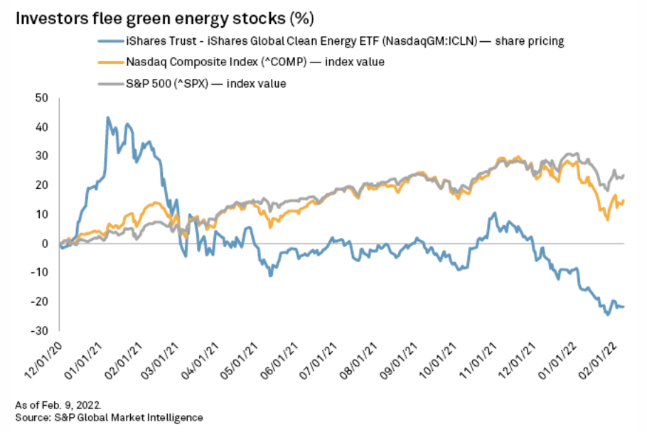 A stock rout that has slashed the value of renewable energy companies 41% in the past year has yet to spook private market investors backing climate technology startups and green infrastructure projects. While listed green energy companies spent 2021 trying to hang onto shareholders amid supply chain disruptions and soaring raw material costs, investors rushed into the private markets for green energy. Private equity and venture capital firms poured $53.7 billion into climate technology in 2021, according to research firm BloombergNEF, and Brookfield Asset Management Inc. launched what it claims is the largest-ever fund dedicated to the transition to a net-zero world.