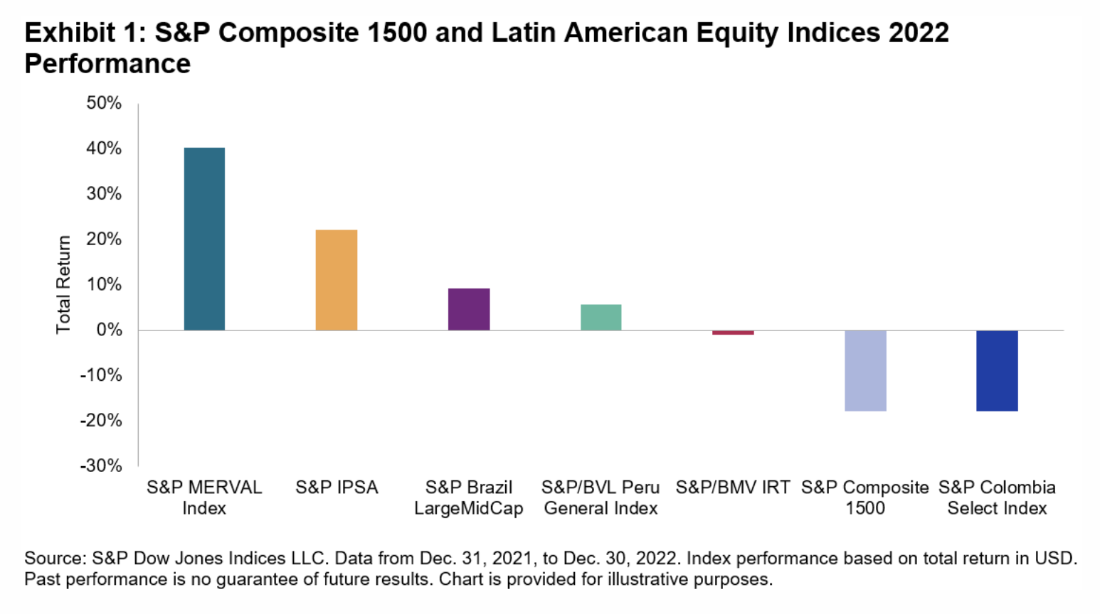 2022 was a challenging year for equity markets, as central banks around the world hiked interest rates in response to surging inflation. U.S. equities were affected by the souring sentiment, with the S&P Composite 1500 down 17.8% in 2022. More broadly, all 25 countries in the S&P Global Developed BMI declined in U.S. dollar terms since the end of 2021, while 15 out of 24 S&P Emerging BMI countries declined by the same measure.