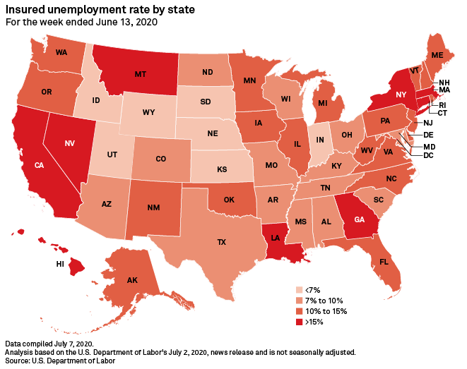 “High PPP funding is correlated with states that have been able to keep unemployment numbers low relative to other states. Six of the top 10 states in terms of total loan approvals as a percentage of small business payroll across that state — South Dakota (93%), Utah (93%), Nebraska (92%), Idaho (91%), Kansas (90%), and North Dakota (90%) — were also among the 10 states with the lowest insured unemployment rates for the week ended June 13,” according to S&P Global Market Intelligence. “Through the first two rounds of funding ended June 30, Florida and Hawaii, two tourism and hospitality/leisure-heavy states, led the way with a 96% PPP approval rate as a percentage of small business payroll, according to the SBA. Virginia (72%) and Massachusetts (73%), meanwhile, had the lowest approval over that span. Massachusetts (15.9%) ranked sixth-highest among states in terms of insured unemployment rate.”