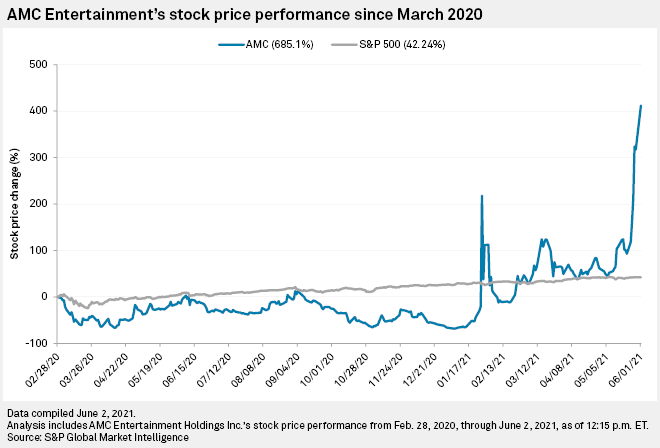 Shares in the movie theater giant doubled to a record high on June 2, sitting above $63 during late afternoon trading as "meme stock" chatter continued to swirl around the stock. Year to date, AMC's shares were up over 3,000%, as of 3:15 p.m. ET on June 2.