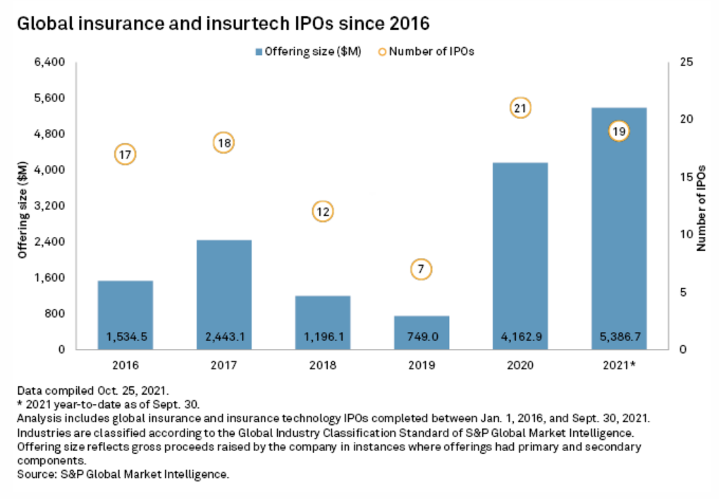 Global insurance and insurtech companies raised about $5.39 billion from IPOs in the first nine months of 2021, the largest amount it has raised through three quarters in at least five years, according to an S&P Global Market Intelligence analysis. The insurance industry also recorded the highest IPO count in that time period since at least 2015, with 19 IPOs through September.