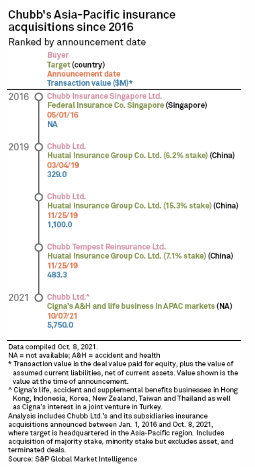 Chubb Ltd. shares moved up after the company announced plans to buy Cigna Corp.'s personal accident, supplemental health, and life insurance business across six markets in the Asia-Pacific region and Turkey for $5.75 billion in cash.