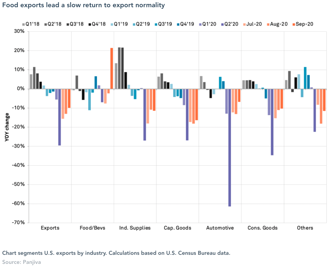 Early action may be needed given U.S. exports have remained weak in the wake of the pandemic. Panjiva’s analysis of official data shows that U.S. international trade activity continued to wane in September, with total merchandise trade having dropped by 5.4% year over year after a 7.6% drop in August.