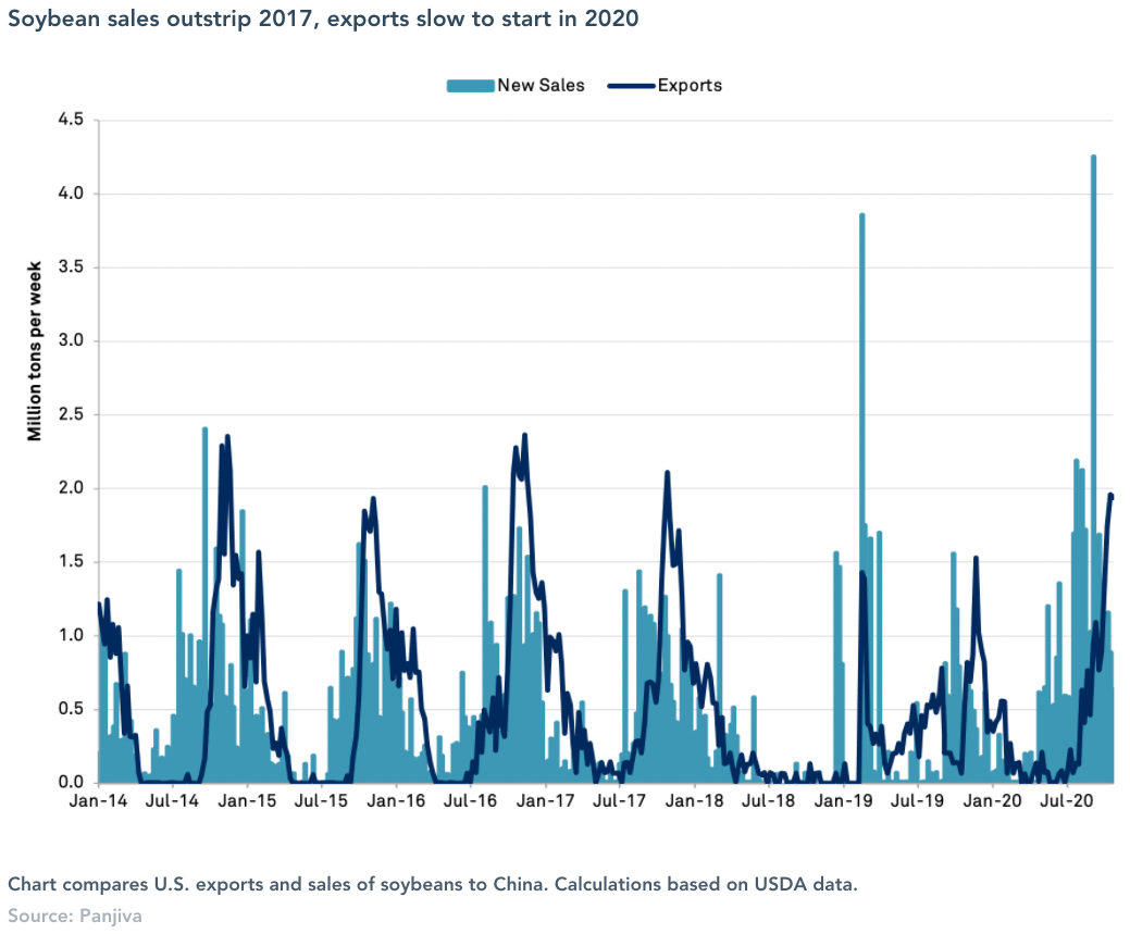 The period also coincides with the peak export season for U.S. farm goods. That may prove out USTR assertions that the agricultural part of the phase 1 trade deal is on track, though that has included the purchase of goods for delivery in 2021. While soybeans are only a fraction of the deal, a surge in shipments is necessary for any part of the phase 1 deal to be delivered anf for a worsening of relations before inauguration to be avoided.