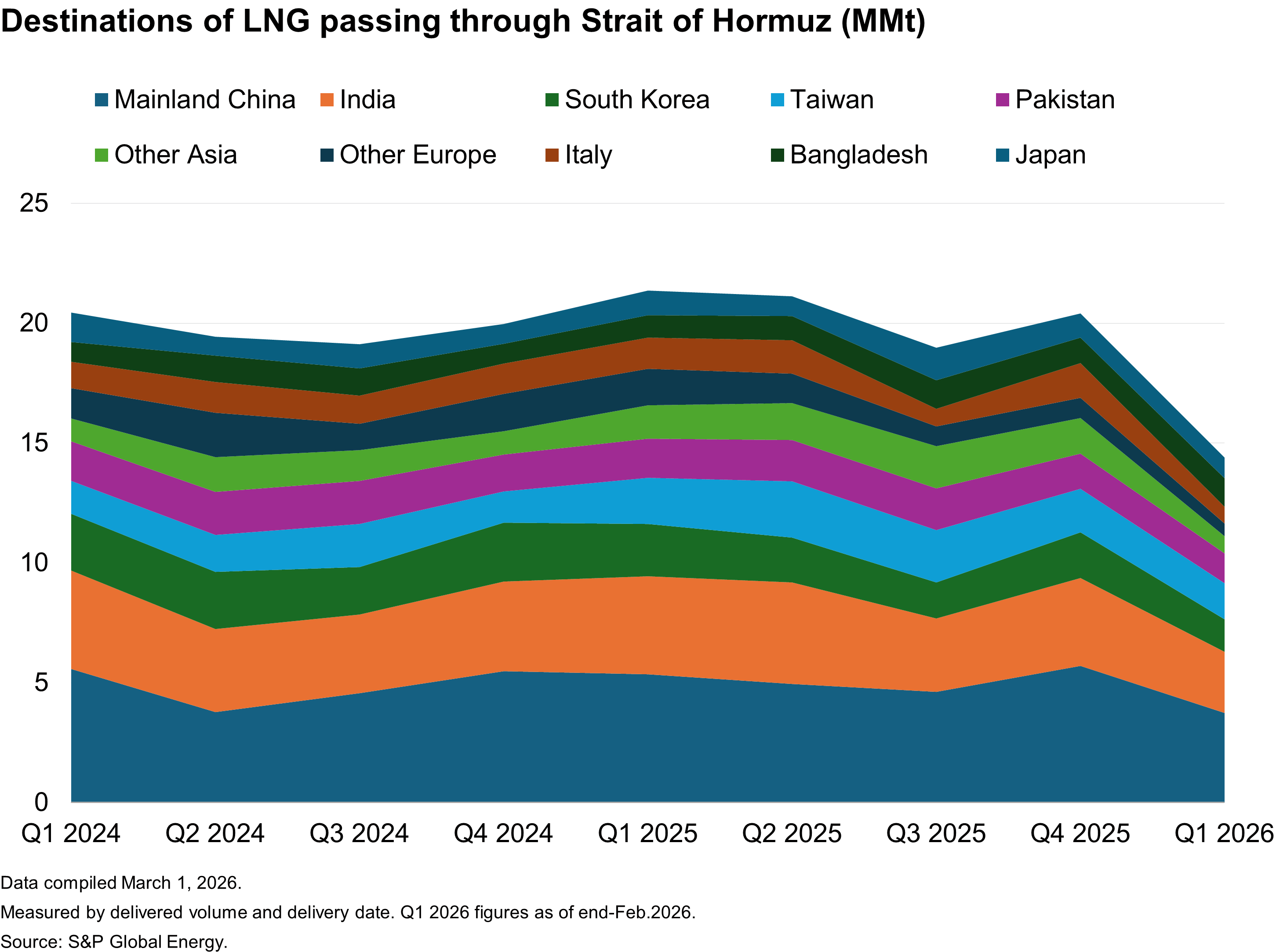 - Gas infrastructure has also taken a direct hit. Qatar Energy declared force majeure to affected LNG buyers on March 4 after halting production March 2. Qatar exported 82.4 million mt of LNG in 2025, representing just under 20% of global exports, according to CERA data.