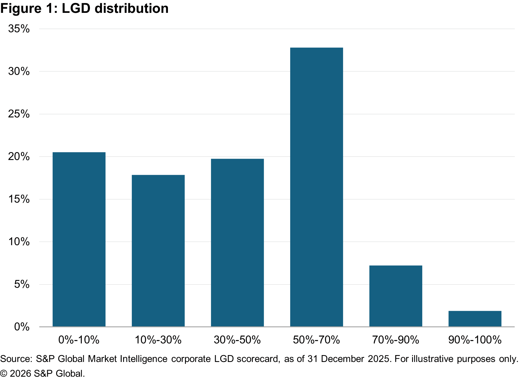 Figure 1 below displays the distribution of the LGD results across six buckets. The first bucket (0%-10%) is for those entities associated with a minimal loss, should they default, while the last bucket (90%-100%) is for those entities associated with a maximum loss. The universe in Q4 appears barbell-like with many firms either in the very low LGD bucket (21% in the 0%-10% bucket) or in significant loss (33% in the fourth bucket with 50%-70% LGD). This observation is in line with the empirical bimodal character of observed recoveries. However, the distribution in Figure 1 indicates that the 45% standardized LGD rule is underestimating or overestimating most cases in our study.