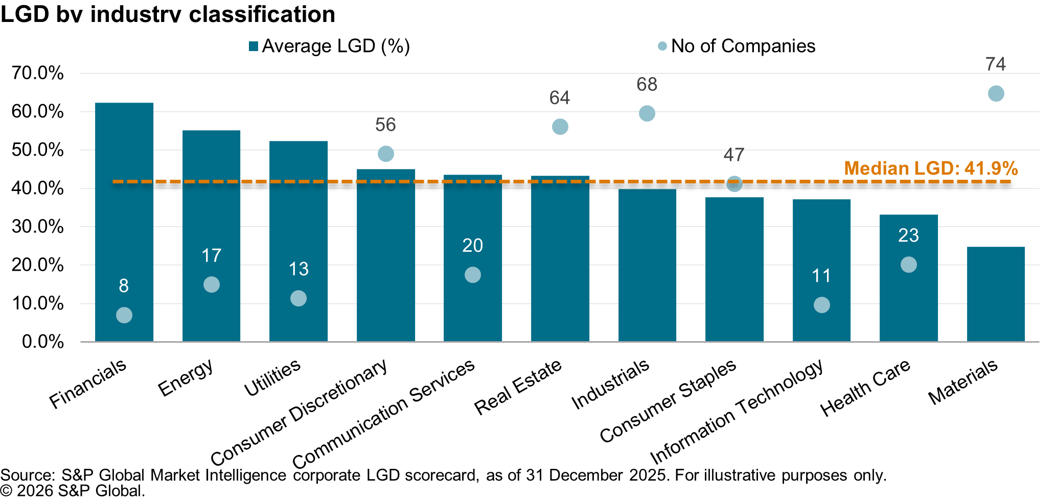 For this blog, we used the S&P Global Market Intelligence LGD scorecard, which is designed to estimate LGD at the exposure level (i.e. facility level), and produces estimates of loss given default, which are point-in-time (PiT), reflecting the current economic conditions. This feature captures the fact that default during an economic downturn is typically accompanied with lower recoveries. We forecasted LGD for 391 entities from the index constituents and found that the mean LGD was 38.7% and median was 41.2%. We expect average LGD to sit above the median in periods/universes where high-LGD tail names exist. In quarterly series, tracking the gap between mean and median could be useful “stress indicator”, where a widening gap can signal a fatter high-LGD tail. Also interesting is that the average LGD is slightly lower than the 45% standardized estimate accepted and used by various financial institutions in the region. Please see the section Data and Assumptions below for data sources and assumptions.