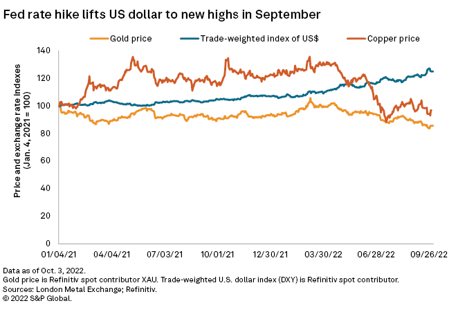 In September, macroeconomic news of inflation — energy and otherwise — and interest rate hikes by several central banks to mitigate the fallout in their respective economies amid the increasing likelihood of a global recession dominated headlines. The U.S. dollar spiked as the Federal Reserve tightened its monetary policy, weighing on precious metals prices. Despite tight market fundamentals, with most industrial metals output constrained by high energy prices, consensus price forecasts for the remaining months of 2022 and for 2023 were downgraded as demand concerns carried sway. Copper prices were the most revised down for each year through to 2026, while cobalt prices for 2024-2025 were significantly bumped up.