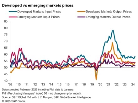 Output price inflation among emerging market firms was meanwhile stable going into 2025, remaining slightly below the long-run average. That said, while price pressures remained subdued, concerns over elevated uncertainties, including the impact of a strong dollar, highlighted the multitude of factors that continue to influence monetary policy decisions among emerging market central banks.