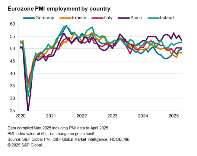 Employment trends continue to vary across the euro area, with further jobs growth in Spain, Ireland and Italy, contrasting with broadly no-change in workforce numbers in Germany and staff retrenchment in France.