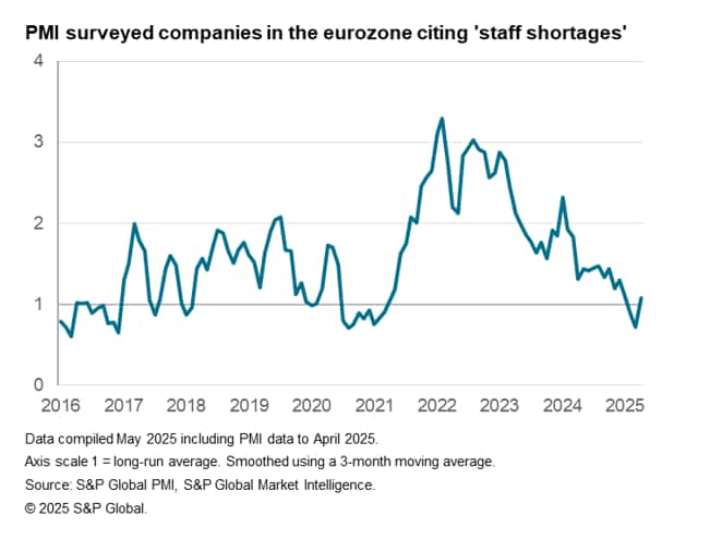 However, reports of staff shortages are currently broadly in line with the long-run average, and backlogs of work across the eurozone have now declined almost every month for the past three years. This suggests that the drop in business confidence - if it is sustained and translates into lower demand and activity - represents a greater risk to the labour market conditions than in previous years.