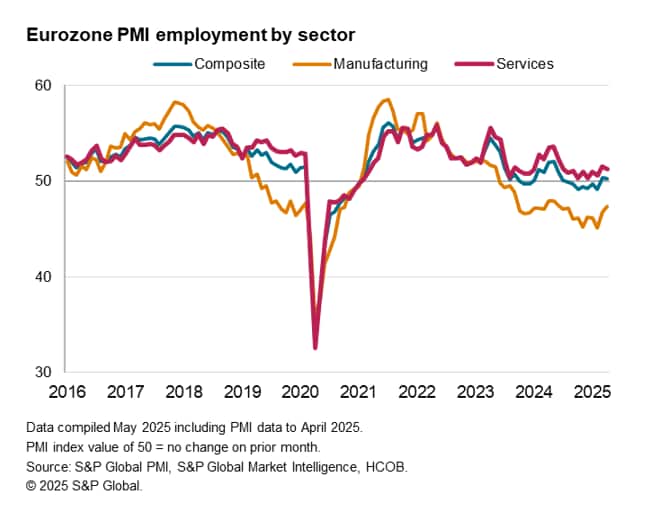 Latest PMI data showed employment rising across the eurozone for the second month running in April, albeit marginally, despite trade-related concerns and uncertainty leading to a notable drop in firms' growth expectations for the coming year.