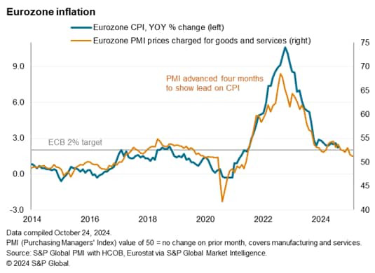 Encouraging news for inflation was provided as firms' selling prices rose in October at the slowest rate since February 2021. A rise in services charges was outweighed by a fall in manufacturing selling prices to reduce the overall rate of inflation, which in recent months has been running at a level consistent with consumer price inflation below the European Central bank's 2% target.