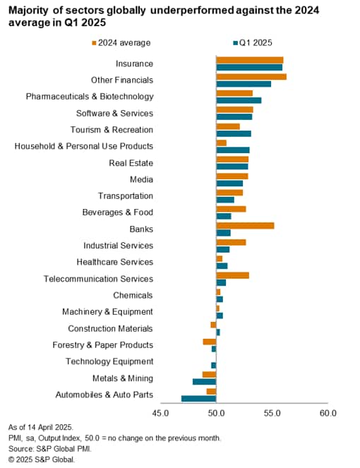 Nonetheless, each of the contributing sectors to the overall Financials category underperformed in the opening quarter of 2025 relative to the average for 2024. Although Insurance and Real Estate saw only a fractional difference, the gap in performance was larger at Other Financials (including auxiliary activities to financial intermediation, insurance and pension funding) and Banks. Moreover, the latter saw the largest gap in performance between the average over 2024 and that of the first quarter of the new year of the 21 monitored sectors.