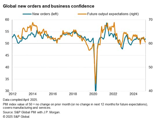 The weakening of sentiment reflected intensifying concern over US tariffs, the economic impact of which was also anticipated beyond the goods-producing sector via lower consumer and business spending on services. Additionally, US companies often cited concern over federal government spending cuts and the associated impact on household confidence. Elsewhere, some support to confidence was seen to allay some of the tariff-related worries, notably in Europe in relation to higher fiscal spending.