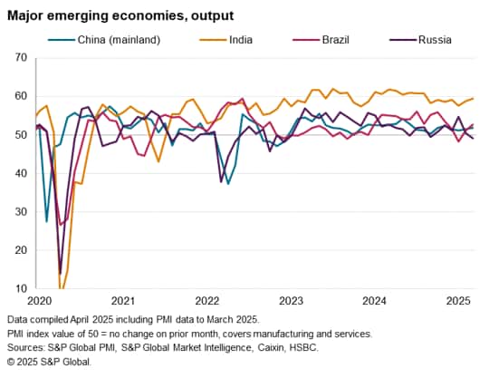 All other BRIC "emerging" economies reported faster expansions, led once again by India, which continued the outperformance seen since July 2022. Growth in India hit the highest since last August as a jump in manufacturing output offset a slight slowing of the service sector's recent strong expansion.