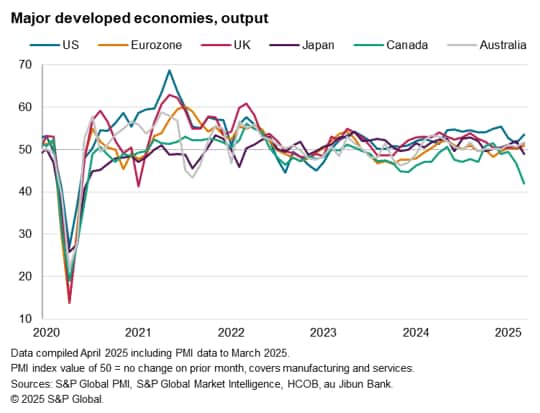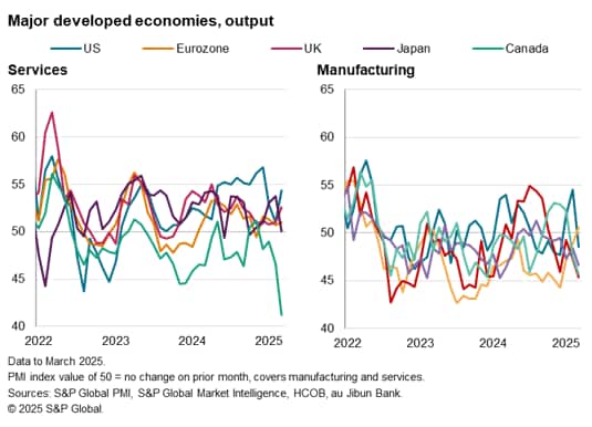In manufacturing, only the eurozone eked out any output growth among the major developed economies in March, reporting the first production rise in two years. However, the rise in part reflected the front-running of US tariffs. The steepest manufacturing declines were meanwhile seen in the UK and Canda, with a sharp fall also seen in Japan. US factory production meanwhile fell after two months of growth.