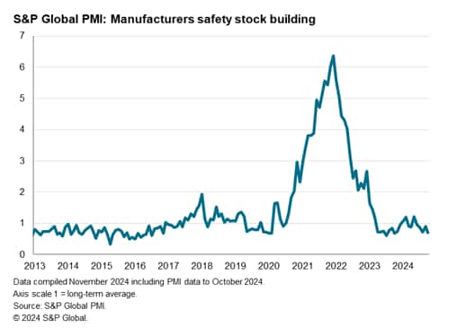 The downturn in global goods trade was partially driven by a sustained inventory reduction among manufacturers. According to data compiled from panel comments, instances of global manufacturers seeking safety stock building dipped further below the long-term average at the start of the fourth quarter, suggesting that since the early post-pandemic period, goods producers have scarcely felt the need to reaccumulate safety stocks.