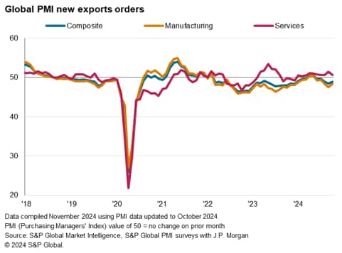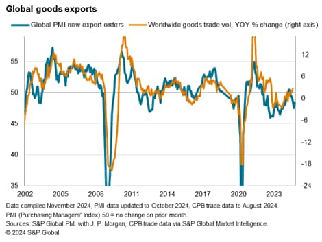The latest fall in manufacturing export orders continued to correspond to global trade volumes falling approximately 3-4% in year-on-year terms into the start of the fourth quarter of 2024.