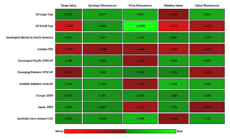 - Developed Europe: Over the Developed Europe universe, our Value Momentum model returned 2.59% on a one month decile return spread basis.