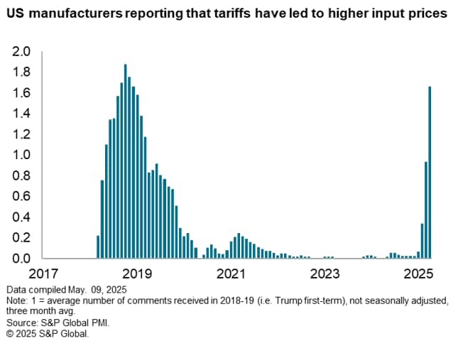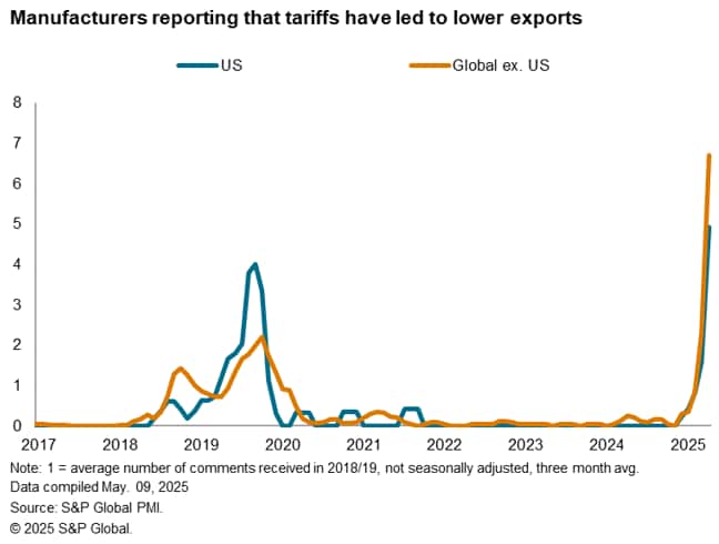 Furthermore, this downturn was not limited to the US's trade partners, with several domestic manufacturers also reporting a decline in new export orders. Reciprocal measures from mainland China and Canada had a partial effect on driving exports down, but anecdotal evidence also highlighted that increased uncertainty had led foreign clients to withhold spending. As such, both our US and Global-excluding-US trackers moved sharply higher in April, with the number of comments received multiples higher than seen during 2018/19.