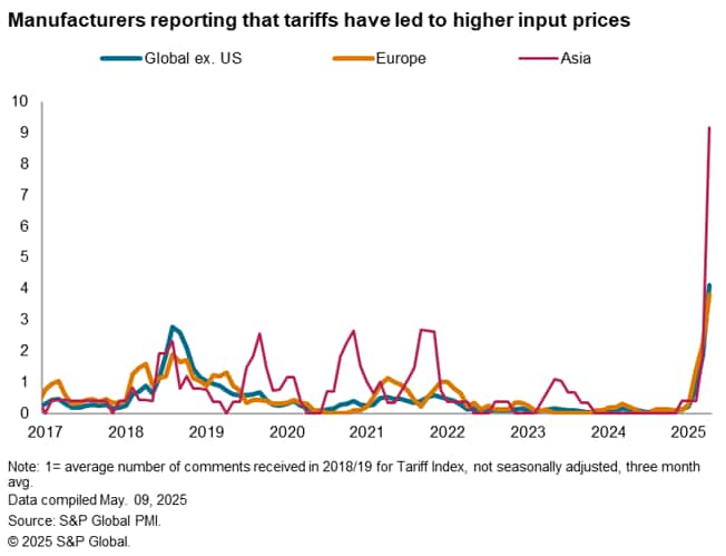 These signals are derived from new tariff indicators added to the S&P Global PMI™ Comment Trackers, a dataset that harnesses the qualitative evidence provided by PMI survey contributors around the world. These trackers allow us to assess the direct impact of changes in global tariffs on businesses, by monitoring comments related to metrics such as exports, input prices, selling charges and business confidence.
