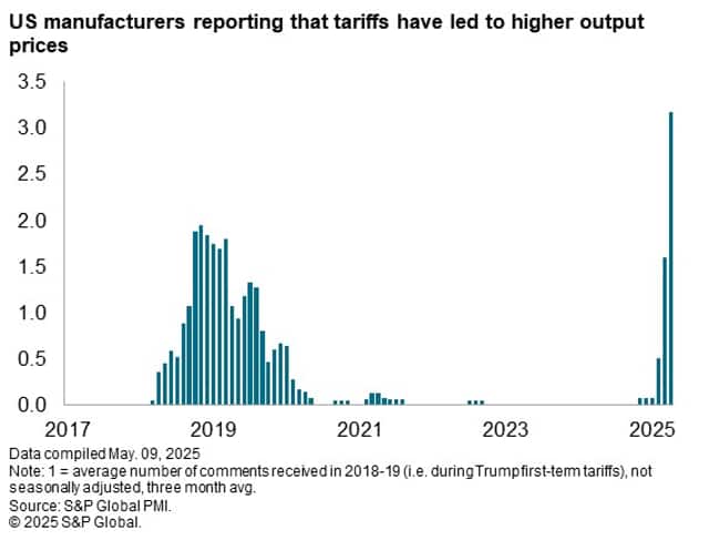 US manufacturers also reported raising their output prices in response to tariffs. In fact, comments on this survey question were the highest on record and twice the level observed in the previous month. As such, US manufacturing output price inflation as measured by the PMIs was the steepest recorded since February 2023, suggesting that producers are generally unwilling to absorb these tariffs in the hope that costs will abate.