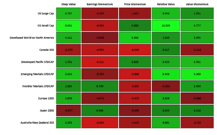 - Emerging Markets: The Value Momentum model had the strongest one month quintile return spread performance, returning 9.30%. The Value Momentum model's one year cumulative performance is still the highest for the EM universe at 29.88%.