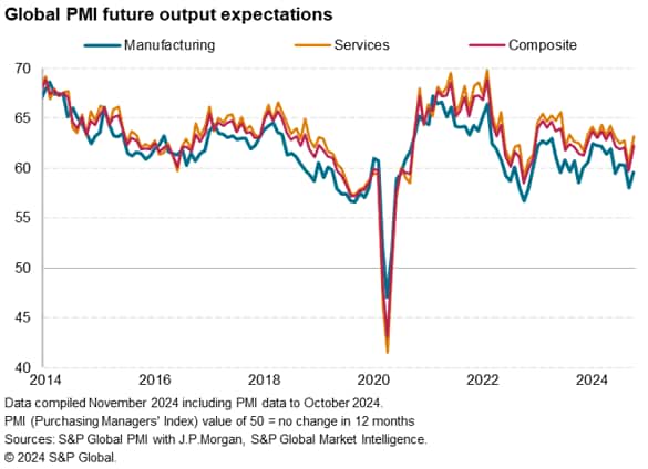 In addition to current output growth edging higher globally in October, business expectations for output in the year ahead also revived. Having fallen to a near-two-year low in September, future expectations rose to the highest since May, recovering in both manufacturing and services.