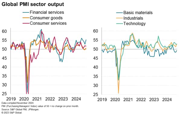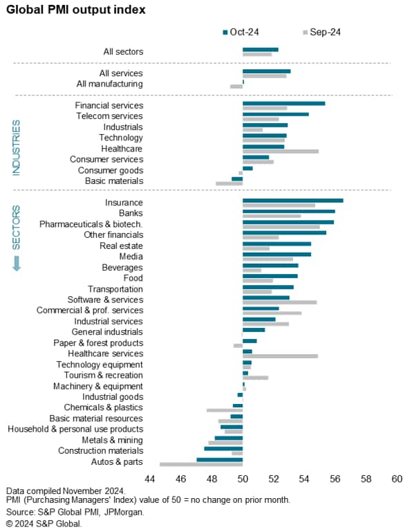 S&P Global Market Intelligence's PMI surveys indicated that global business activity expanded for a twelfth straight month in October, the rate of expansion ticking up from September's eight-month low. The headline J.P. Morgan Global Composite PMI® Output Index, covering manufacturing and services in over 40 economies, rose from 51.9 in September to 52.3, its highest since August.