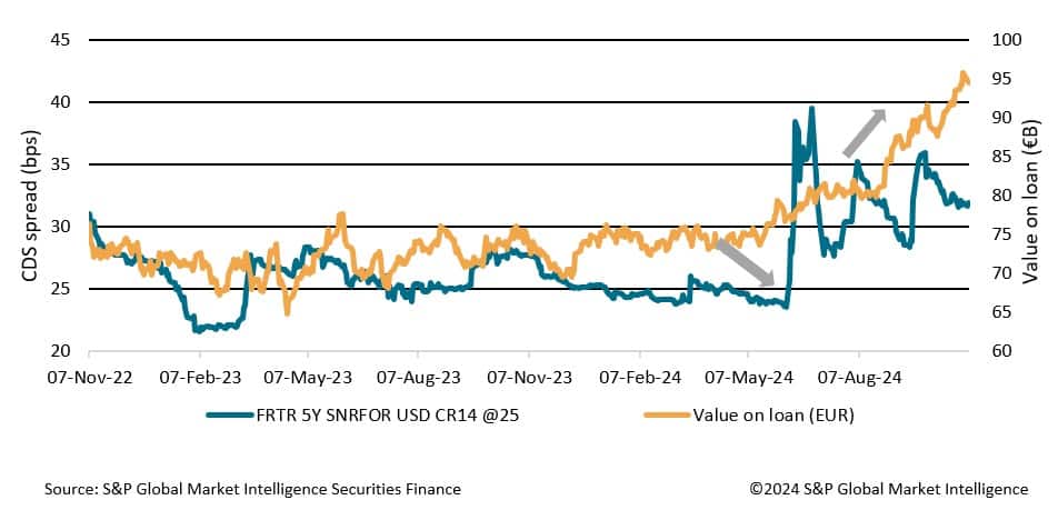 Across fixed income assets, a parallel trend is evident. Increased borrowing has been observed, driven by mounting concerns regarding the challenges of implementing the fiscal reforms necessary to address the rising French deficit. As political uncertainty intensified over the summer, this instability began to exert pressure on the credit default swap (CDS) spreads of French government bonds, leading to a corresponding increase in their value on loan. This dynamic highlights the market's reaction to the evolving political climate and its implications for sovereign credit risk.