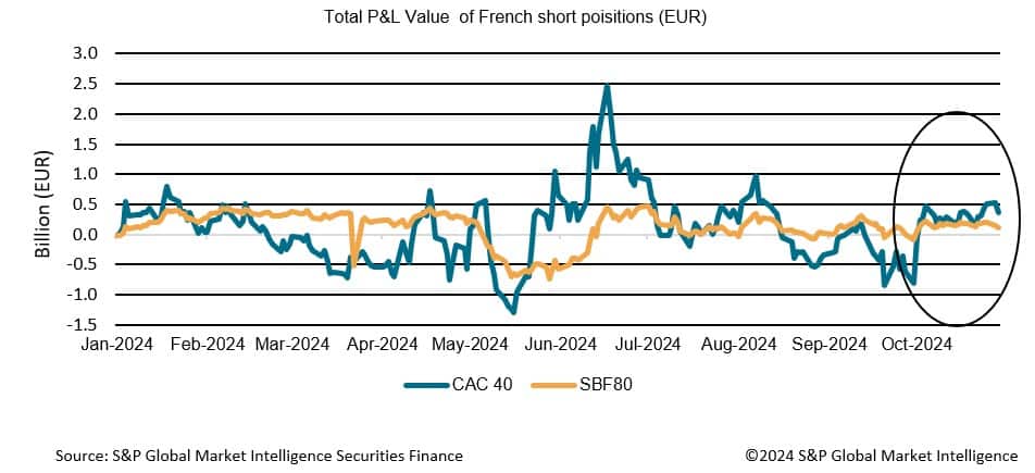 Examining the percentage of market capitalization on loan, it is clear to see an increase across both the CAC40 and the SBF80 since November. As the political situation has deteriorated, a recent rise in activity across the SBF80 can also be seen heading into December.