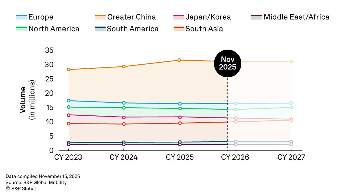 Europe: The light vehicle production outlook for Europe has been increased by 20,000 units for 2025 and 21,000 units for 2026, despite a reduction of 80,000 units for 2027. This adjustment is primarily driven by stronger production results from Volkswagen and Stellantis, although concerns around the Nexperia situation will continue to be monitored. The production outlook remains roughly flat year-over-year for 2026, with potential upside depending on upcoming EU commission announcements.