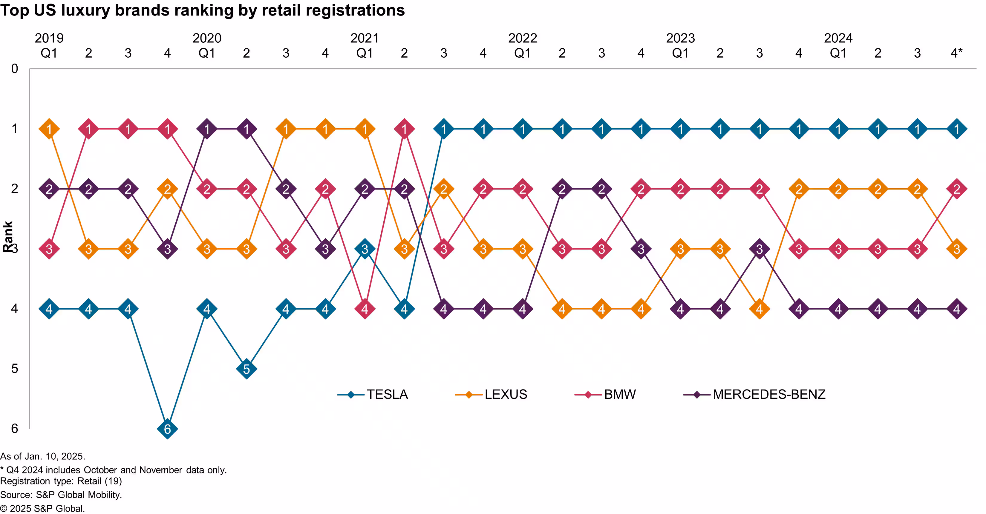 According to S&P Global Mobility's registration data, Lexus has topped all non-Tesla luxury brands in retail registrations for each of the past four quarters for which we have complete registration data (Q4 2023 - Q3 2024). This is the first time in six years Lexus has enjoyed such a prolonged period of success.