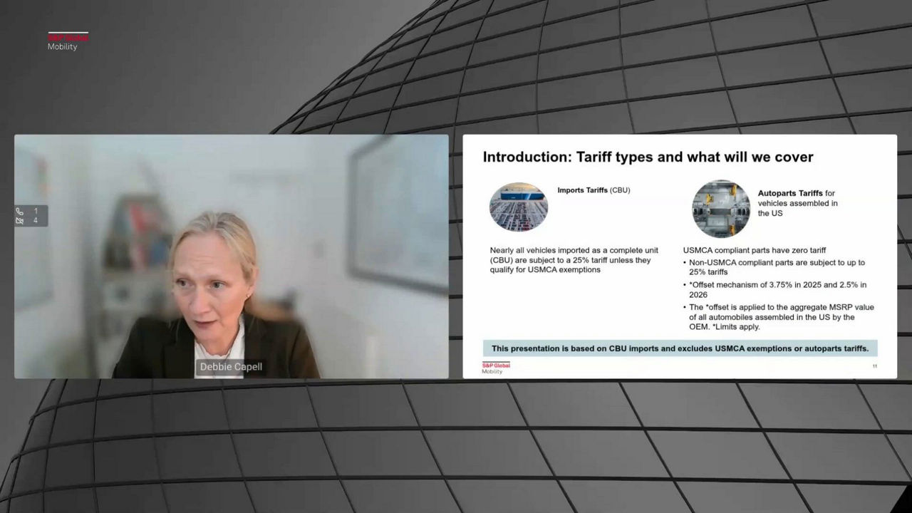 Debbie Capell, Executive Director at S&P Global Mobility, offered an assessment on import tariffs for complete vehicles—those fully built either domestically or overseas and sold in the US. Understanding when and where vehicles are produced and sold is key to tracking how these factors influence sales, pricing, and production changes.