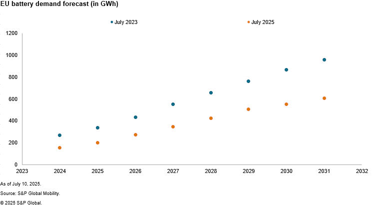 Europe's EV momentum is cooling, making battery companies more cautious. S&P Global Mobility has lowered its EU battery demand forecast for 2024–31. We now project demand will be down by more than 40% for 2025 and 36% lower in 2030.