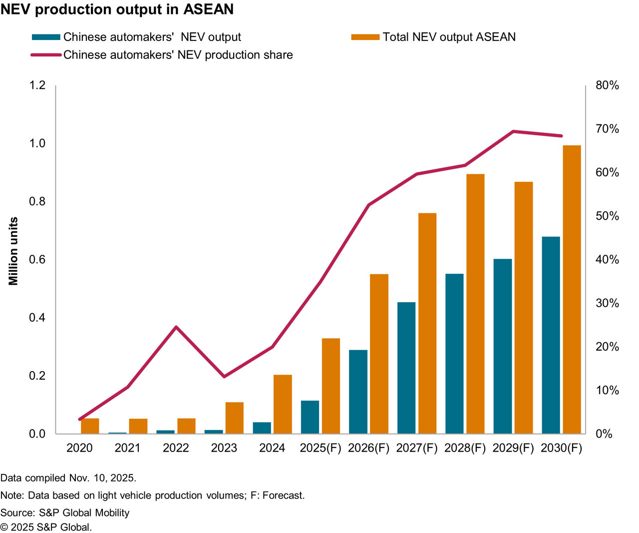 According to S&P Global Mobility’s light-vehicle production forecast, the combined output of NEVs by Chinese car manufacturers in ASEAN is expected to account for 68% of the region’s total NEV production by 2030—a notable jump from 20% in 2024. These projections reflect broader vehicle manufacturing industry trends, showing a steady rise in NEV production from 5.3% of the total region’s output in 2024 to 21% by 2030.