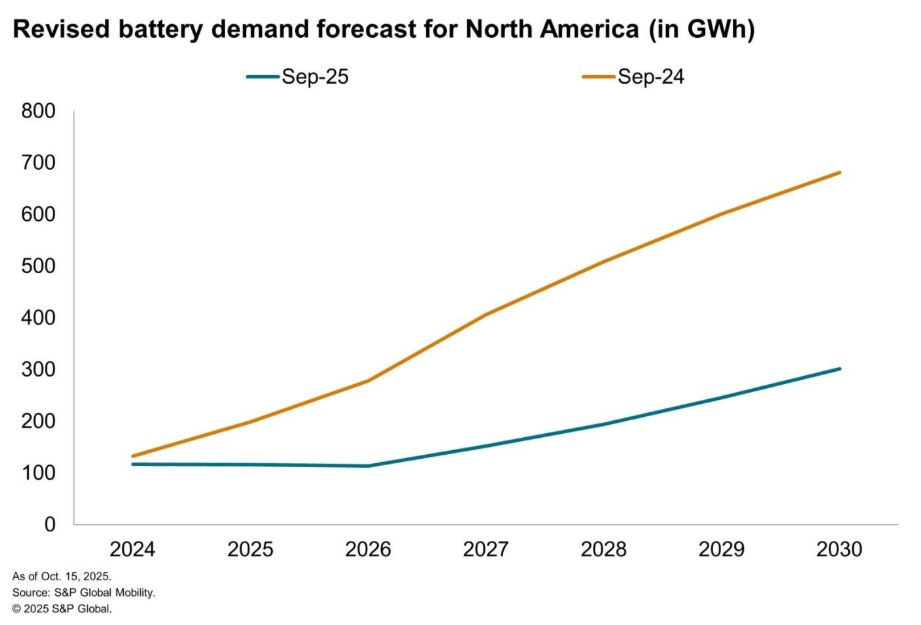 The IRA contributed directly to EV sales growth while strengthening US EV battery supply chains. However, we expect that removing these credits will raise EV prices and lower market demand. S&P Global Mobility’s new forecast for yearly battery demand in North America in 2030, expressed in gigawatt-hours, has declined by approximately 56% compared to the 2024 forecast.