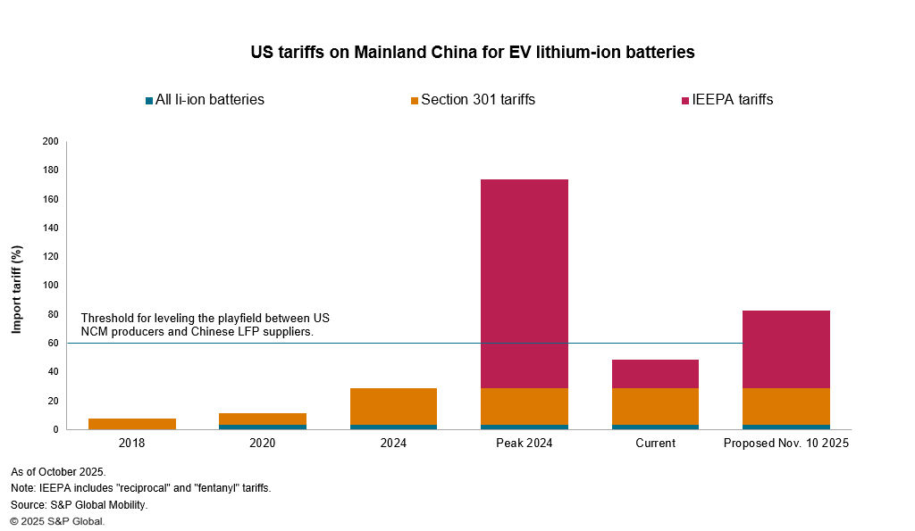 S&P Global Mobility estimates that rising tariffs on imported components, such as cathode and anode active materials (CAMs and AAMs), could increase the price of manufacturing nickel-cobalt-manganese (NCM811) battery cells in North America to $95 per kilowatt-hour in 2025. This increase would make them 60-70% more expensive than LFP cells produced in mainland China.