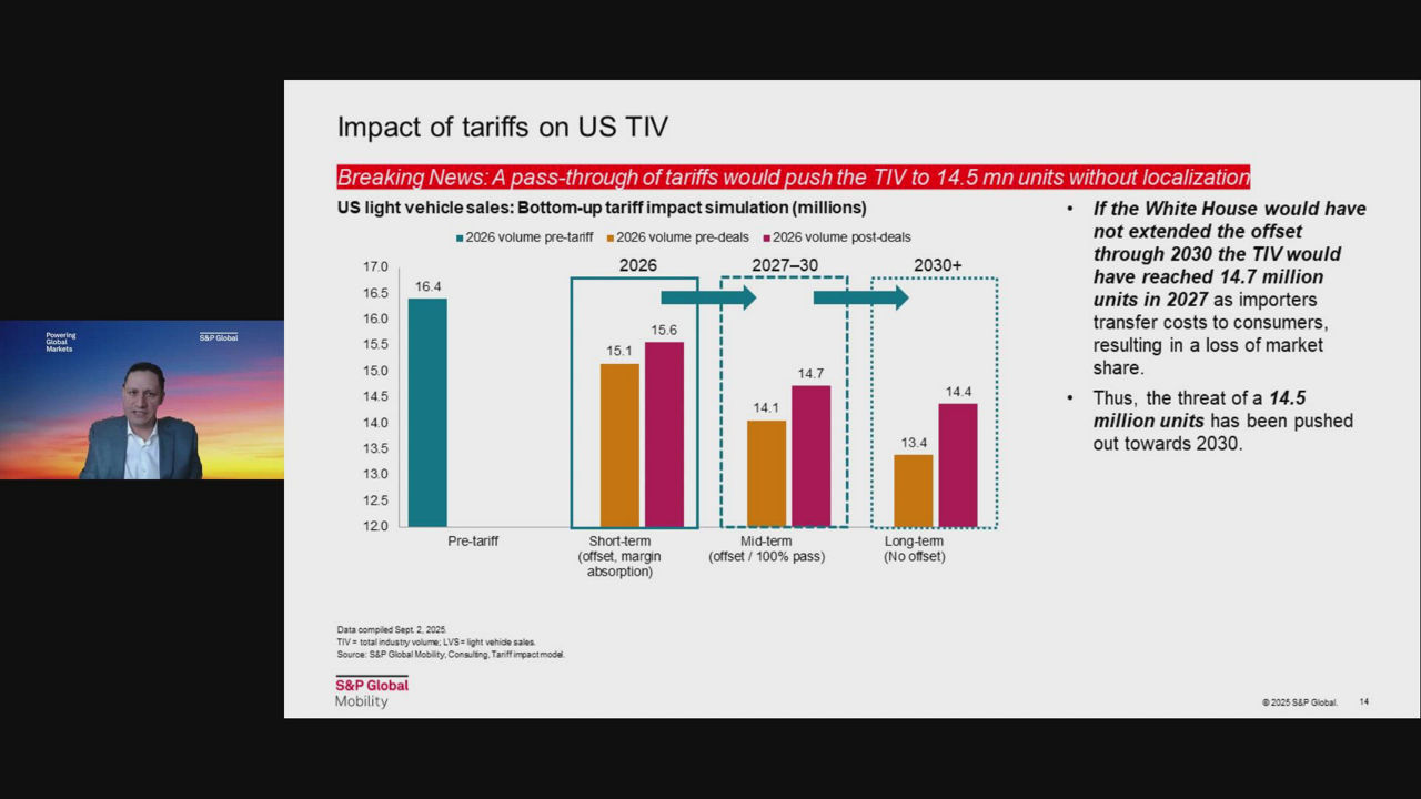 The automotive tariffs landscape has created extraordinary forecast volatility. Original tariff proposals threatened to deteriorate the US market significantly. While recent trade deals with Japan, the EU, and South Korea—combined with government offsets—have stabilized projections, significant complexity remains.