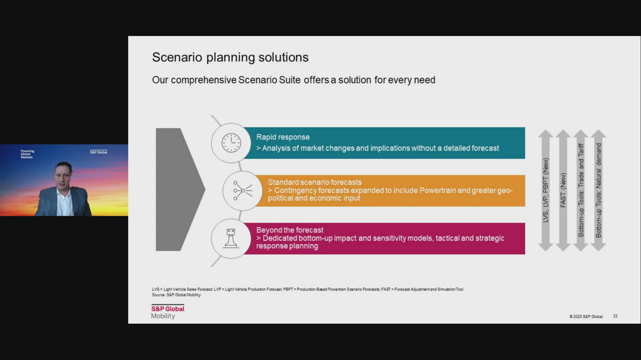 “This is what we're calling ‘beyond the forecast,’” said Vildozo, explaining S&P Global Mobility’s scenario planning solution for OEMs, the Forecast Adjustment and Simulation Tool (FAST). “It's not our standard approach where we look at the macro and we start to derive that into vehicle sales. When we're looking at beyond the forecast, we look at the lowest level of granularity and build that up... We want to provide as many different perspectives as possible to put you in the driver's seat.”