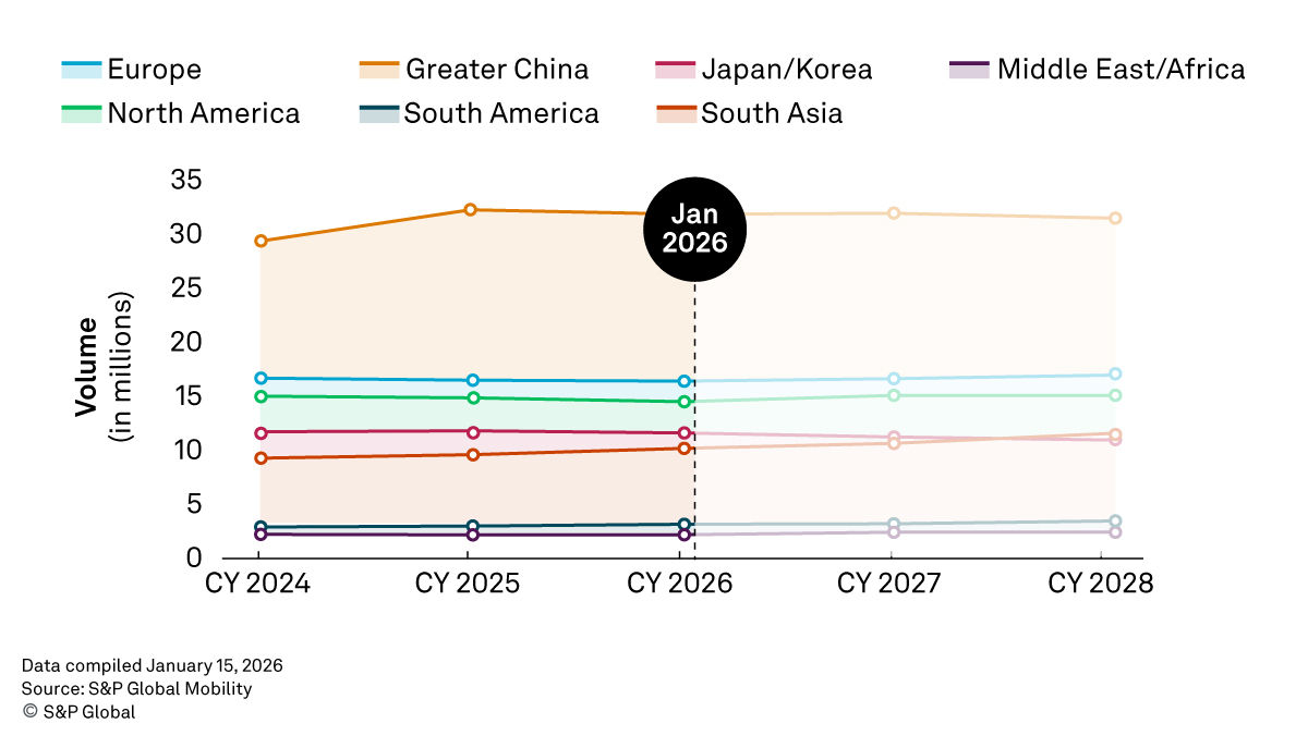 South Asia’s production forecast has been raised for 2026-2028, led by India’s robust demand outlook following reductions in the Goods and Services Tax (GST) for various vehicle sizes. Automakers are adjusting production schedules to maximize opportunities from this demand surge.