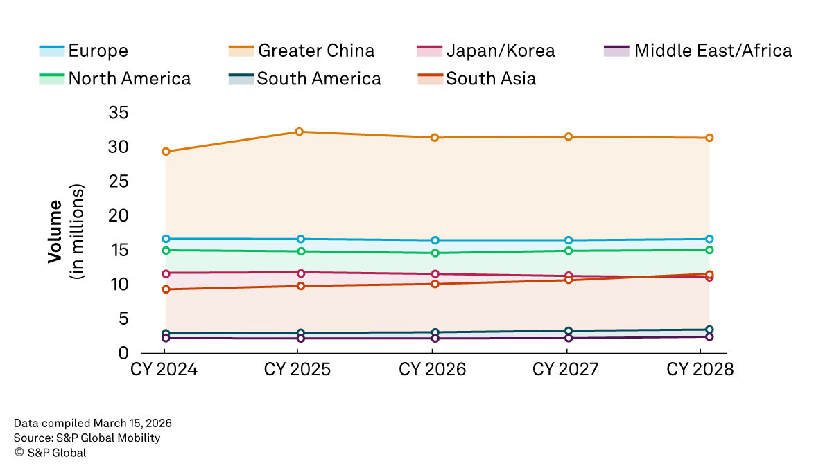 Greater China’s light vehicle production outlook was reduced by 239,000 units for 2026 and 156,000 units for 2027. While there was a post-holiday demand recovery in monthly terms, year-on-year performance remains weak due to low consumer confidence and the Iran conflict. Exports remain a growth driver, but structural headwinds like destocking, component pricing and availability, overseas localization, and regulatory tightening led to further downward revisions.
