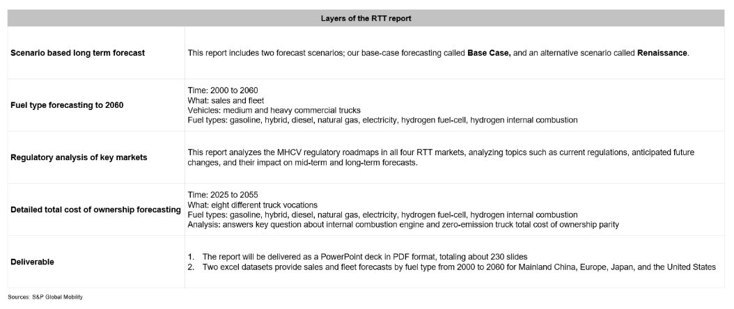 The latest Reinventing the Truck (RTT) report by S&P Global Mobility offers a scenario-based long-term forecast to 2060, addressing key questions about the future of trucks and of trucking in the context of the global energy transition.