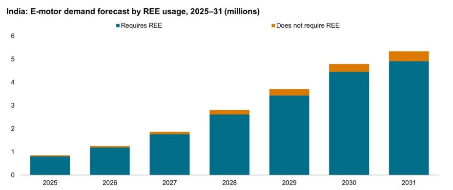 According to S&P Global Mobility, battery electric vehicles made up about 4.1% of India’s passenger vehicle production in 2025 and are projected to increase to 17.3% by 2031, while hybrid passenger vehicles represent roughly 10% of the market and are expected to grow to approximately 36.5%. Consequently, India’s e-motor demand is projected to rise at a compound annual growth rate of 36% over the period. Throughout the forecast horizon, rare earth element-dependent e-motors are expected to account for most of the e-motor demand, reinforcing the need for a secure and reliable rare earth value chain.
