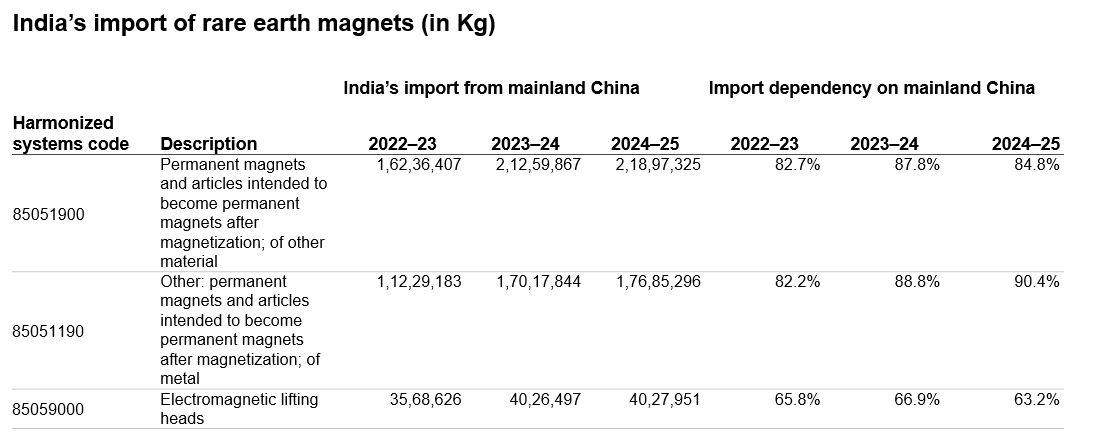 Although India possesses substantial rare earth resources, its domestic production of permanent magnets is still developing, with most imports coming from China, accounting for 60%–80% by value and 85%–90% by volume from 2022 to 2025.